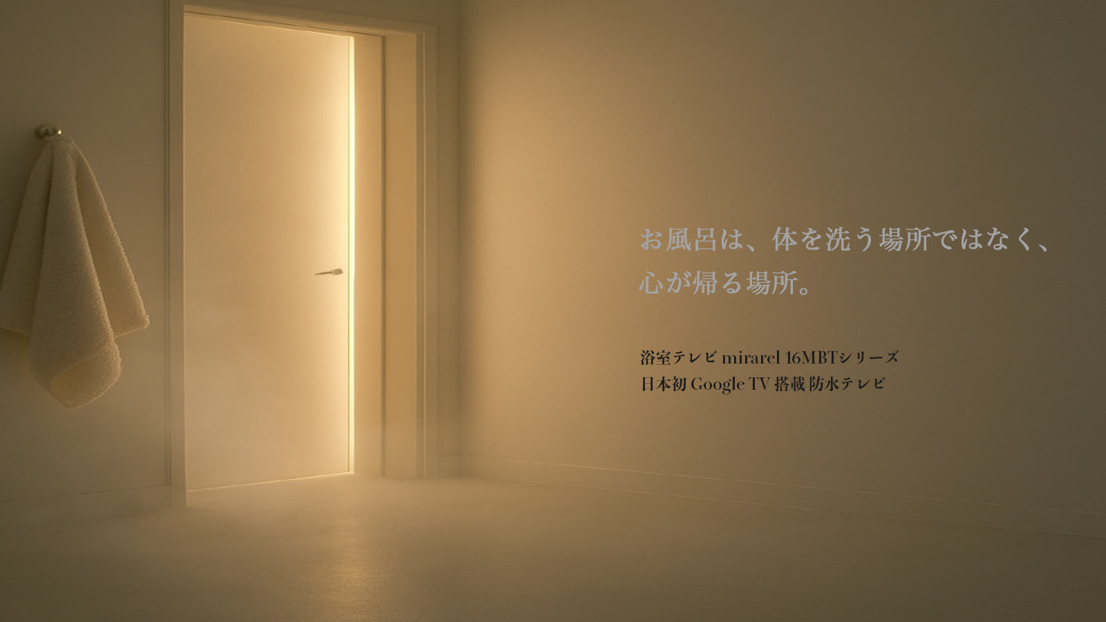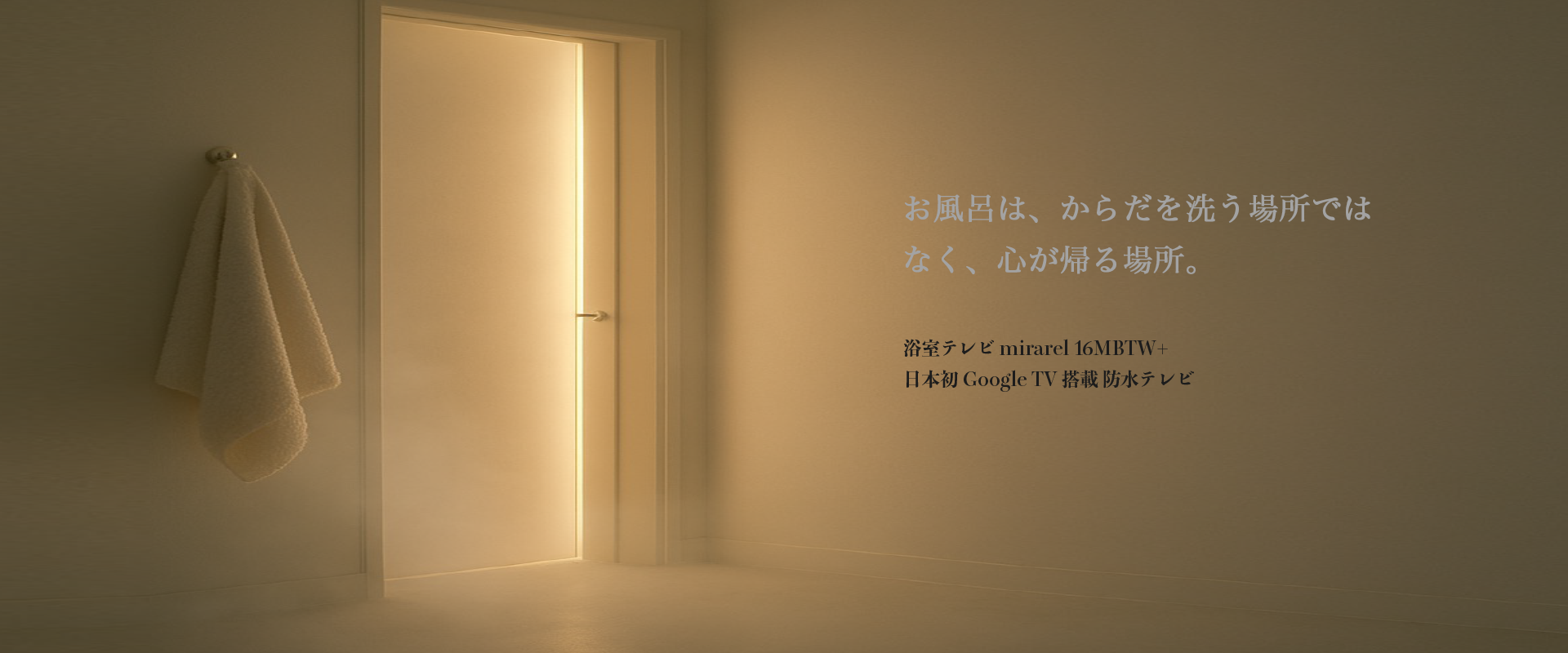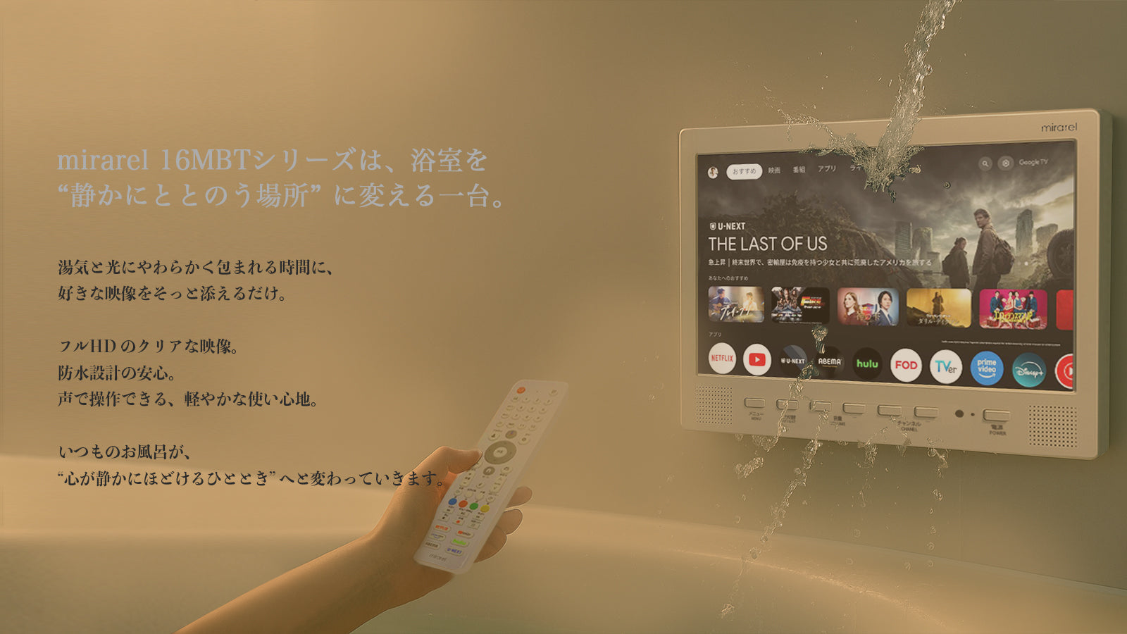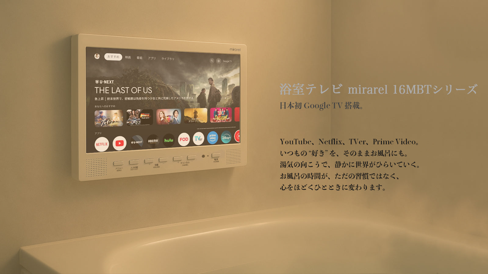 mirarelは浴室テレビながら、これ一台でWi-Fiまたは有線LANでインターネットに接続し、さまざまな動画コンテンツが利用できるスマートテレビです。