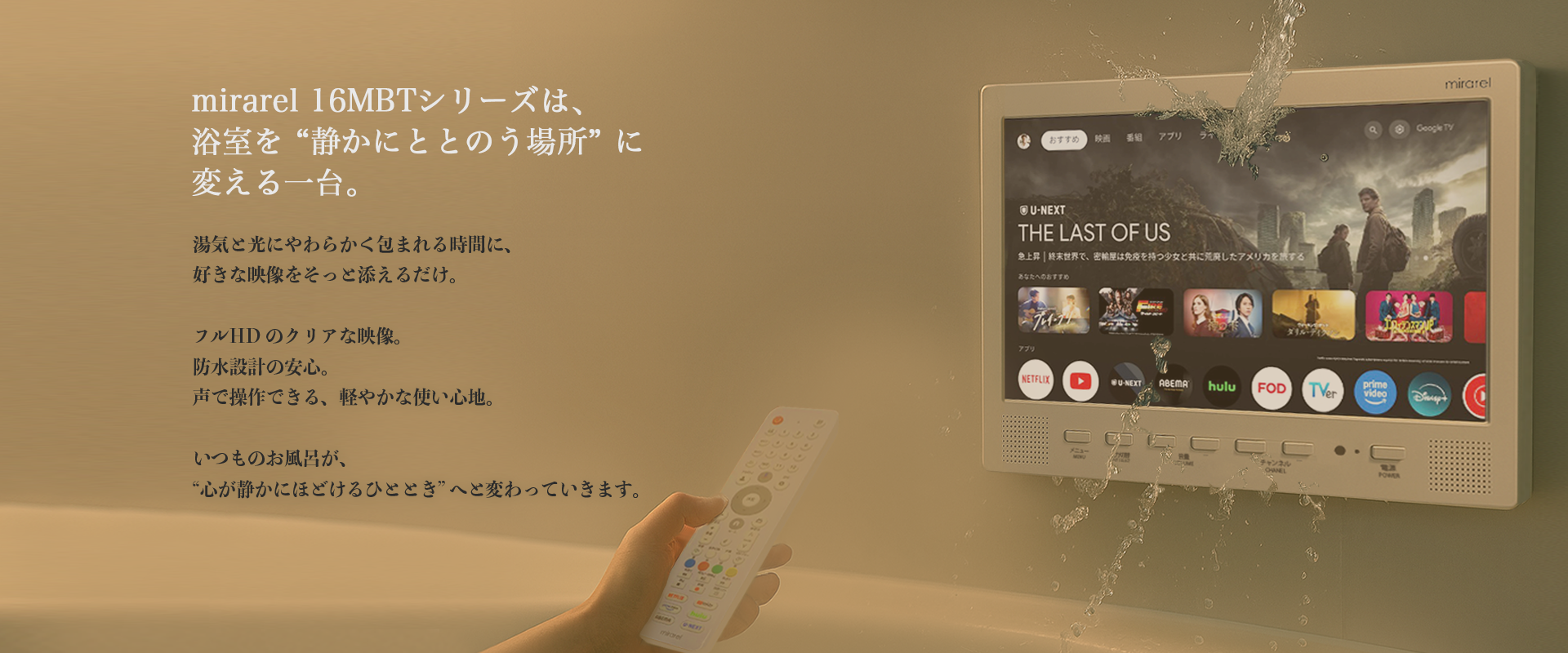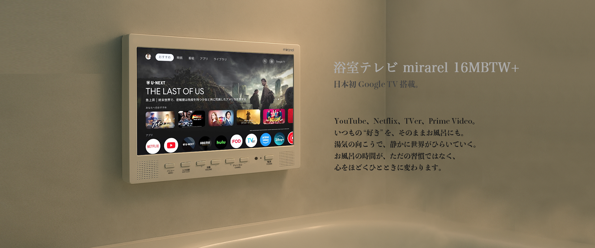 mirarelは浴室テレビながら、これ一台でWi-Fiまたは有線LANでインターネットに接続し、さまざまな動画コンテンツが利用できるスマートテレビです。
